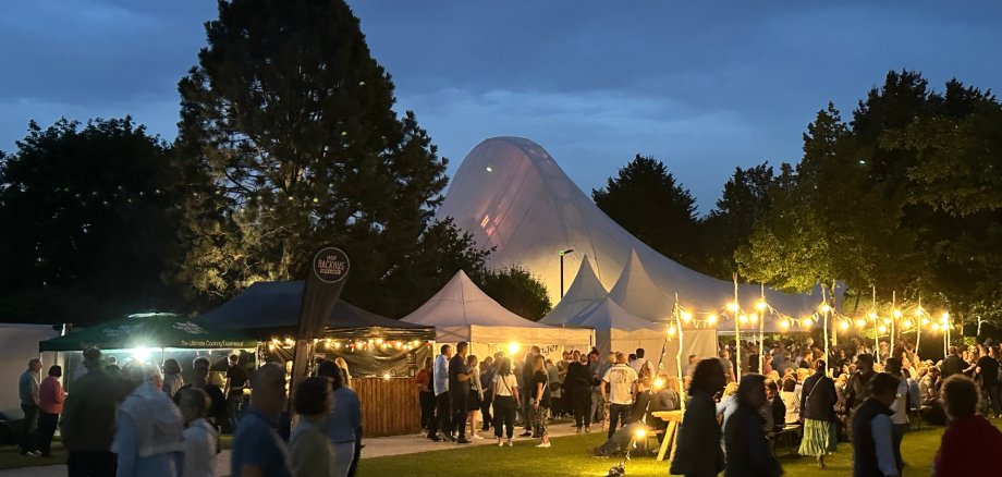 Lange Holztische mit Lichterketten schaffen Orte, an denen man sich in Ruhe hinsetzt, anstößt, erzählt und ankommt. Genau wie man es zu Hause tun würde – nur mit der Kulisse eines weitläufigen Parks, der im Abendlicht seinen ganz eigenen Zauber entfaltet.
